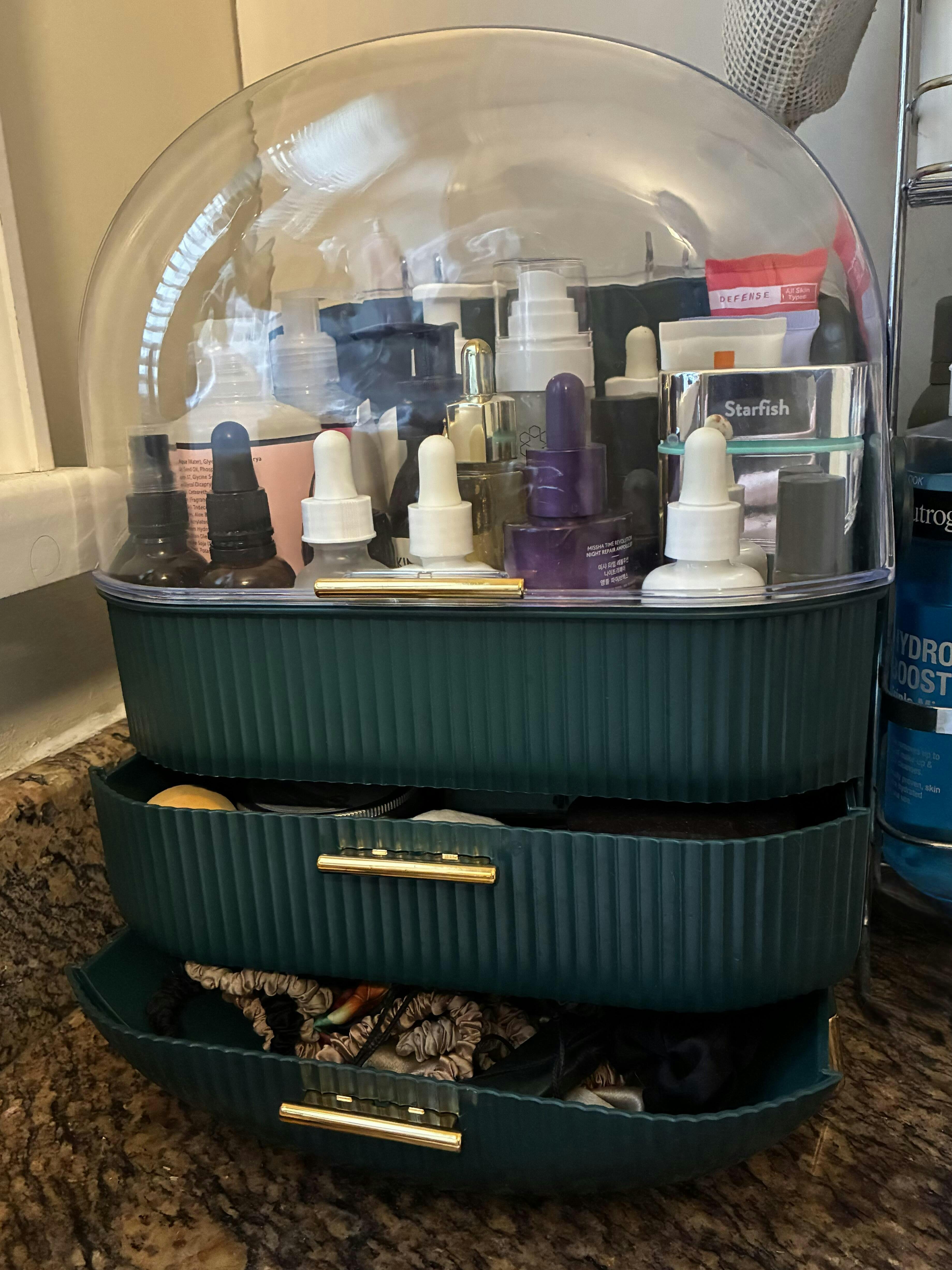 I really needed to tidy up all the lotions and potions and serums and creams in the bathroom, this storage box is perfect! The top part holds a surprising amount, first drawer is a decent size, the bottom drawer is a bit shallow but good for hair ties and scrunchies. I am happy with my purchase and would recommend.
